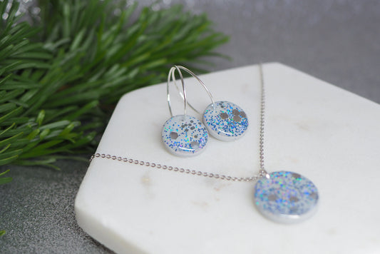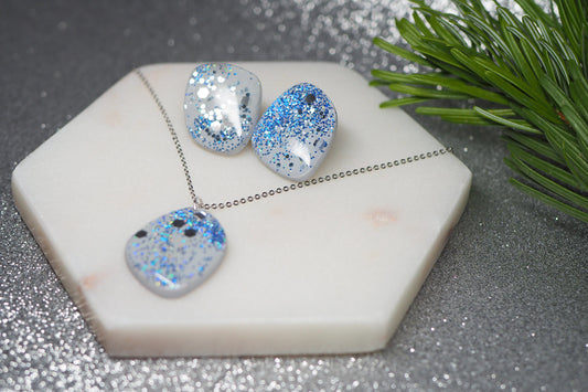 Handgemachtes Schmuckset für den Winter und Weihnachten aus Polymerton, Silber Grau Blau Glitzer, Ohrstecker und Kette mit Anhänger