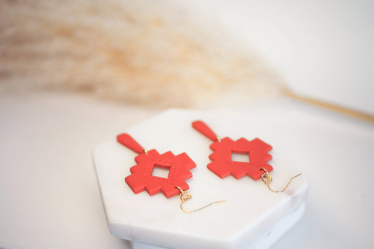 Handgemachte Ohrringe aus Polymerton in Terrakotta mit vergoldeten Ohrhaken, Azteken Inka Schmuck, Kreuz, Verzierung