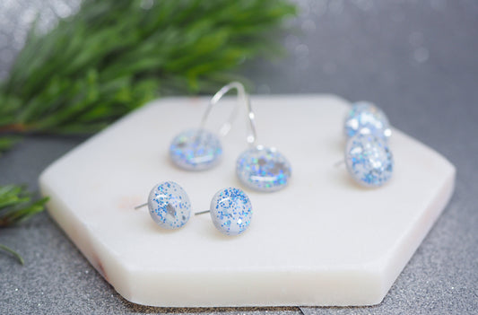 Handgemachte Ohrringe für den Winter und Weihnachten aus Polymerton, Silber Grau Blau Glitzer, Ohrstecker, Creolen Kreolen