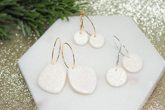 Vergoldete oder Versilberte Creolen mit weißen, glitzernden Anhänger in verschiedenen Größen