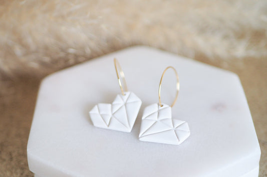 Vergoldete / Versilberte Creolen mit handgemachten Anhängern in Herz Form aus Polymerton, minimalistische Fimo Ohrringe in Origami Stil