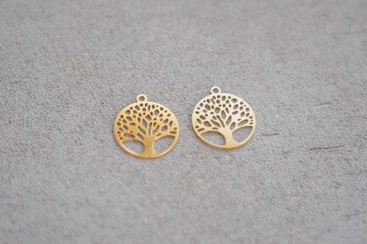 10x filigrane Lebensbaum Anhänger aus Edelstahl, 15mm in Gold, 18 Karat echt vergoldet, Baum des Lebens, Schmuckzubehör,