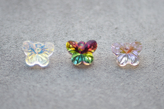 10 Schmetterling Anhänger aus Glas, 15mm x 12mm, facettiert irisierend Regenbogen, weiß gold lila bunt grün, Schmuckzubehör