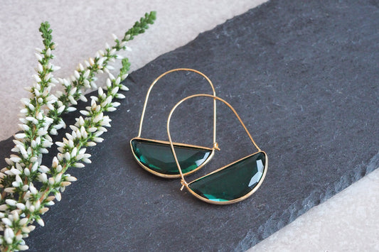 Große Ohrringe mit Glasschliff-Element, echt vergoldet, Smaragdgrün oder Transparent, schlicht reduziert modern minimalistisch