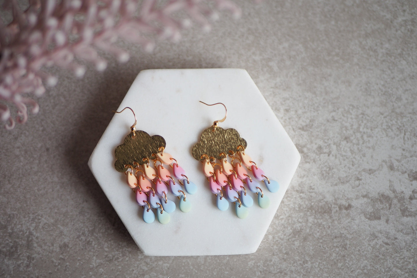 Regenbogen Ohrringe aus Polymer Ton, handgemachte Regentropfen mit Pastell Farbverlauf, echt vergoldet, LGBTQIA Pride Accessoires aus Fimo